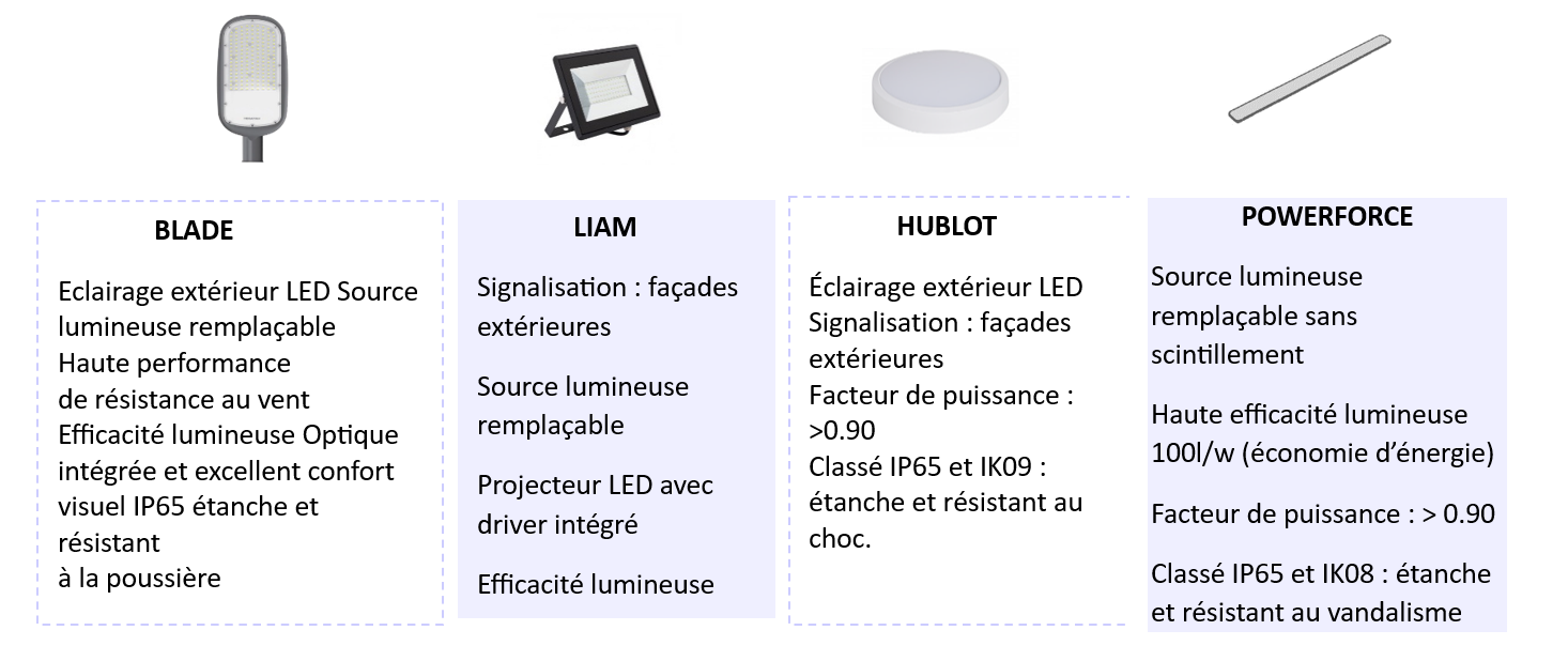 est en charge de la fourniture et de l’installation des équipements commandés. Les exploitants peuvent choisir parmi 4 types de luminaires, avec pour chacun, des puissances différentes en fonction de la hauteur et du besoin d’éclairage :