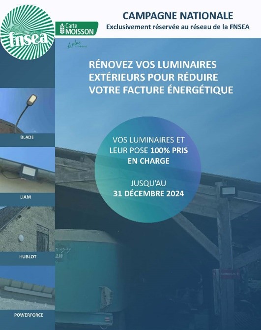 TOTALEnergies Marketing France, partenaire de la FNSEA depuis 2022, prend en charge intégralement le remplacement et la pose des luminaires extérieurs.L’objectif de cette campagne est d’accompagner les exploitants agricoles à réaliser des économies d’énergie grâce à de nouveaux luminaires extérieurs plus sobres et plus performants.