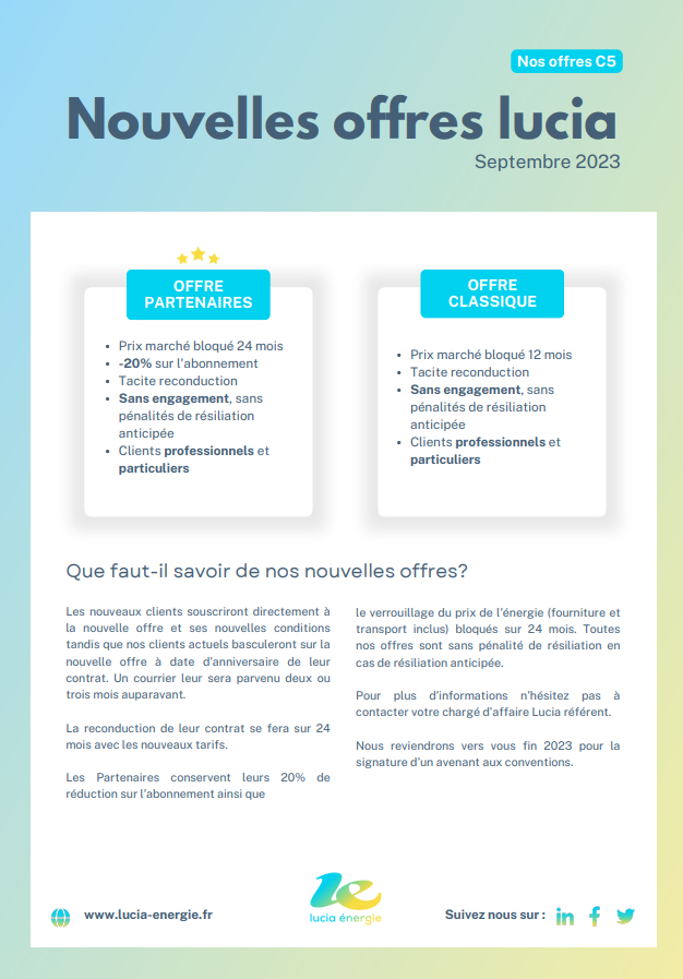 LUCIA propose à nouveau des contrats C5 (BT < 36 kVA) mais avec de nouvelles conditions. Pour nos adhérents déjà clients chez LUCIA, vous recevrez 2 mois avant l’échéance de votre contrat, un courrier de leur part vous informant des nouvelles conditions tarifaires qui seront automatiquement mises en place sans réaction de votre part.
